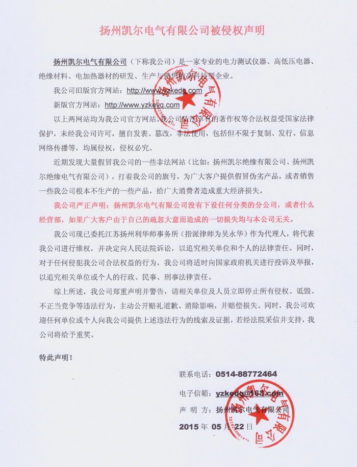 特此聲明! 聯(lián)系電話:0514-88557066 電子信箱:yzkedq@163.com 聲 明 方:揚(yáng)州凱爾電氣有限公司 2015年 05月 22日