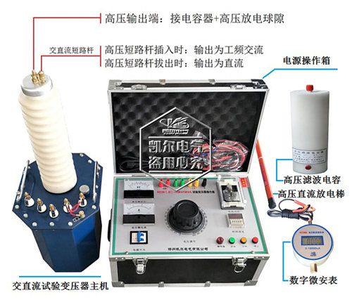 KESBJZ系列特種輕型高壓試驗變壓器除了可于交流工頻耐壓試驗,如果配以同等電壓等級和同等容量的電容、硅堆及高壓直流微安表,便可組裝成直流高壓試驗裝置,可以測量高壓直流泄漏電流。