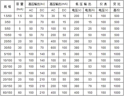 、表格中“直流高壓輸出”一欄,為交直流兩用試驗變壓器的直流高壓輸出值;